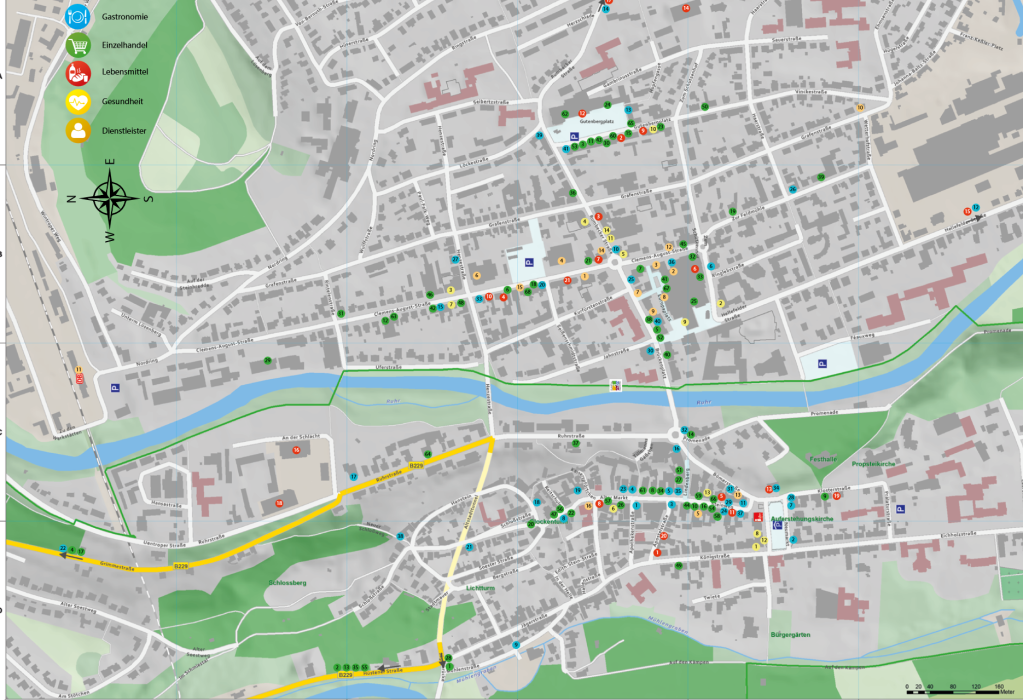 Die Geschäftswelt des Stadtteils Arnsberg erstreckt sich von der historischen Altstadt über die Neustadt mit seinem Brückencenter hinweg bis zum Gutenbergplatz.